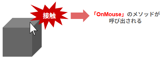 もう少し詳しく言うと、Colliderコンポーネントが付いているオブジェクトにマウスカーソルが接触すると、OnMouseのメソッドが呼び出されることになります。