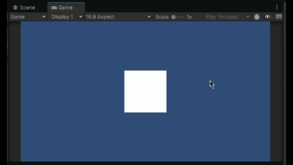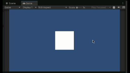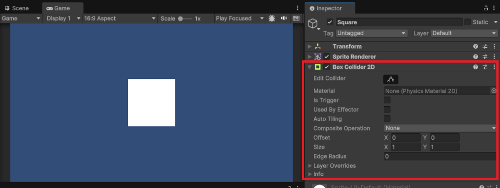 ここでは、2Dゲームで以下の四角いオブジェクトを配置して、「Box Collider 2D」のコンポーネントをアタッチしています。