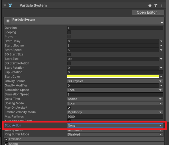 パーティクルシステムで作成したエフェクトをオブジェクトプールで管理しているような場合に、StopActionの設定を使うと、再生が終了したタイミングでプールに返却する処理を行うことができます。