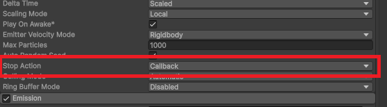 あとは、Prefab化したパーティクルシステムのStopActionの設定を「Callback」に変更しておきます。
