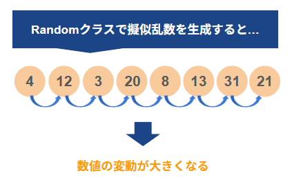 一般的に、Unityなどで擬似乱数を使う場合、Randomクラスの関数を使うことが多いですが、以下のように値がランダムに取得されるため、それぞれの値同士の変化量は大きくなります。