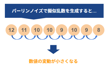 このようにパーリンノイズは、少しずつ変化する乱数を取得することができるという特徴があります。