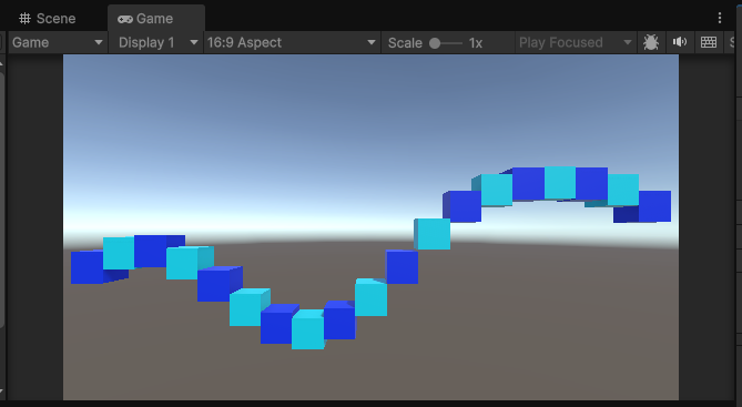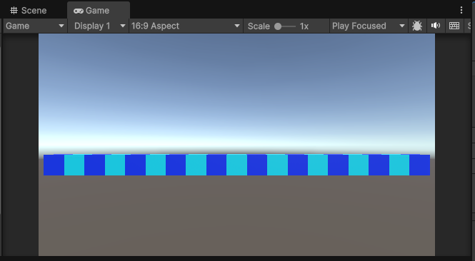 例えば、以下のように四角いオブジェクトを並べておき、それぞれのオブジェクトの高さをスクリプトから変更できるようにしておきます。