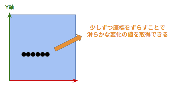 この平面座標上に、それぞれの値が徐々に変化するようなパターンが準備されていて、X座標とY座標を指定してあげることで、その座標に位置する値を取得することができます。