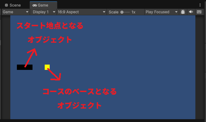 まず、以下のようにスタート地点となる3×1の横長のオブジェクト(黒色)と、コースの基準となる1×1の正方形のオブジェクト(黄色)を作成しておきます。