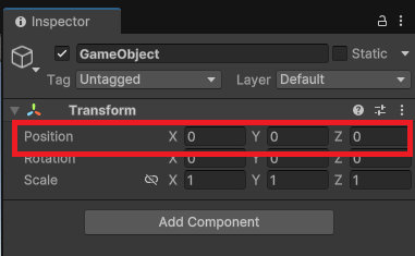 Unityエディター上で、それぞれのオブジェクトのインスペクターウィンドウにあるTransformののpositionの値が、このワールド空間における座標にあたります。