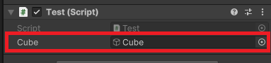 }5行目でオブジェクトを取得するための変数をpublicを付けて宣言しておき、インスペクターウィンドウから指定しておきます。