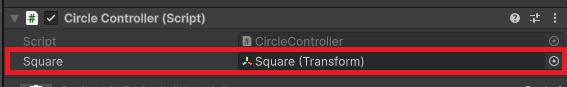 }5行目でTransform型の変数をpublicで宣言していて、インスペクターウィンドウからSquareのオブジェクトを入れておきます。
