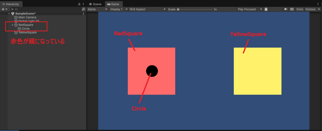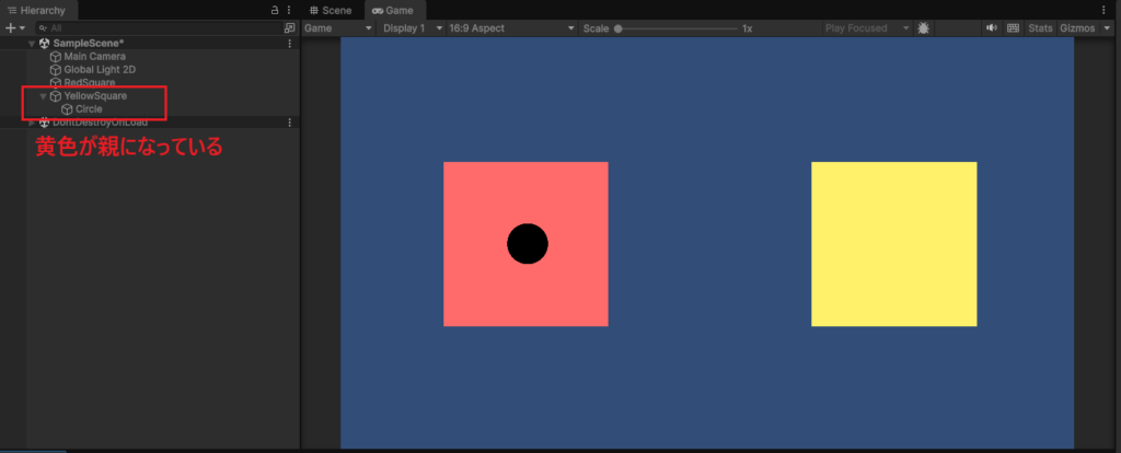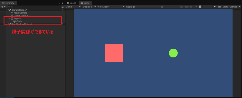 ゲーム画面の表示は変わっていませんが、ヒエラルキーウィンドウではSquareが親オブジェクトとなり、その中にCircleが入っているのが分かります。
