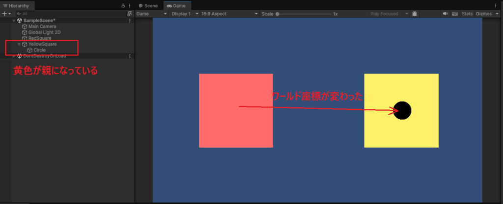 注目すべき点として、親となるオブジェクトが変わっても、Circleのオブジェクトのワールド空間における座標位置は変わっていないのが分かると思います。
