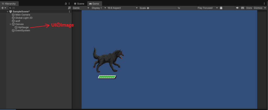 例えば、以下のようにキャラクターの下部に、HPを表すゲージをUIのImageを使って配置しておきます。