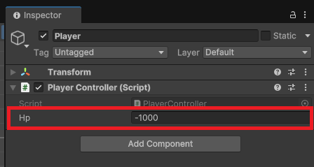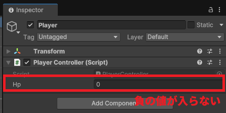 すると、インスペクターから負の整数を入れることができなくなるので、入力ミスの発生を防ぐことができます。