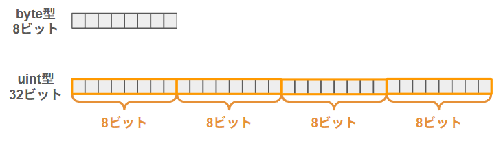 そして、byte型は8ビット(1バイト)、uint型は32ビット(4バイト)で表されているので、uint型には4つのbyte型を格納することができます。