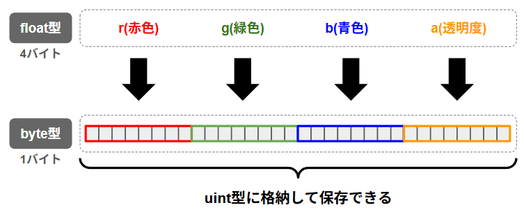 この仕組みを使うことで、UnityのColor構造体で色を表している赤色(r)、緑色(g)、青色(b)、透明度(a)の4つのfloat型の変数をbyte型に変換した後に、1つのuint型に格納することで、メモリを効率的に使うことができます。