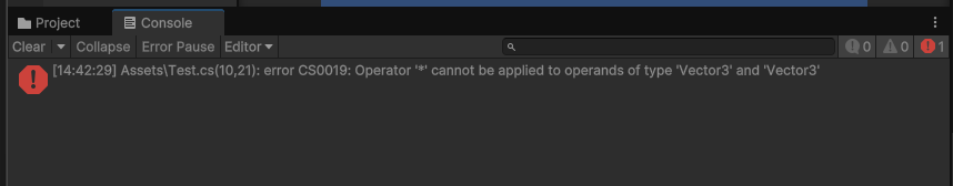 しかし、Vector3同士の掛け算を行う場合、同じように「*」の記号を使って記述しても掛け算されずにエラーが発生してしまいます。